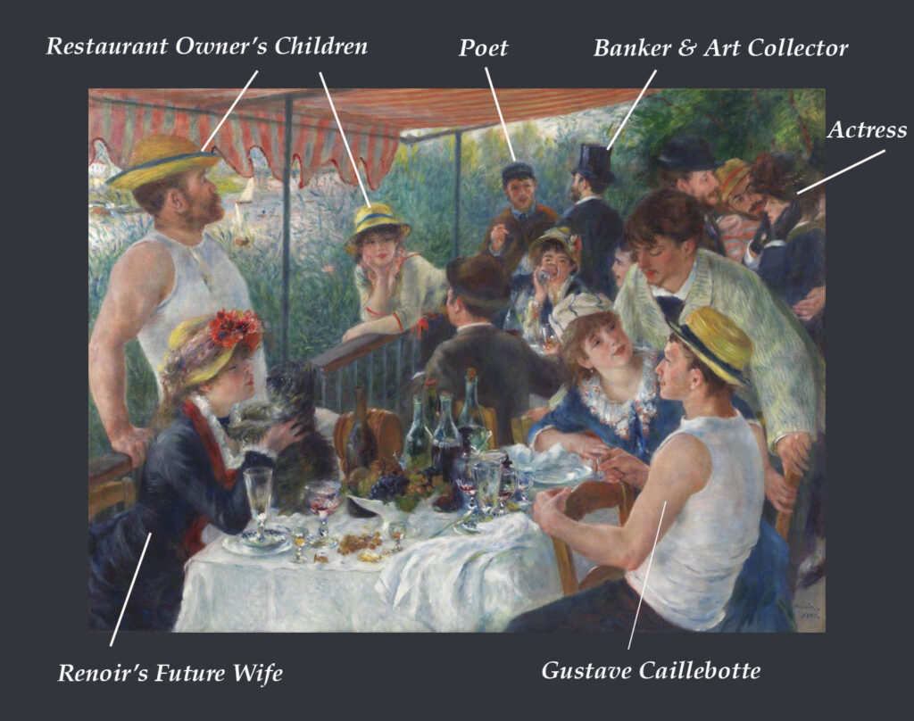 Painted in 1880-1881 and exhibited at the annual French salon the following year, The Luncheon of the Boating Party encapsulates the spirit of joy, leisure, and camaraderie during a period of renewed optimism and prosperity (the Belle Epoque) in France. It portrays a group of friends gathered together on a sunny afternoon after boating along the Seine River.